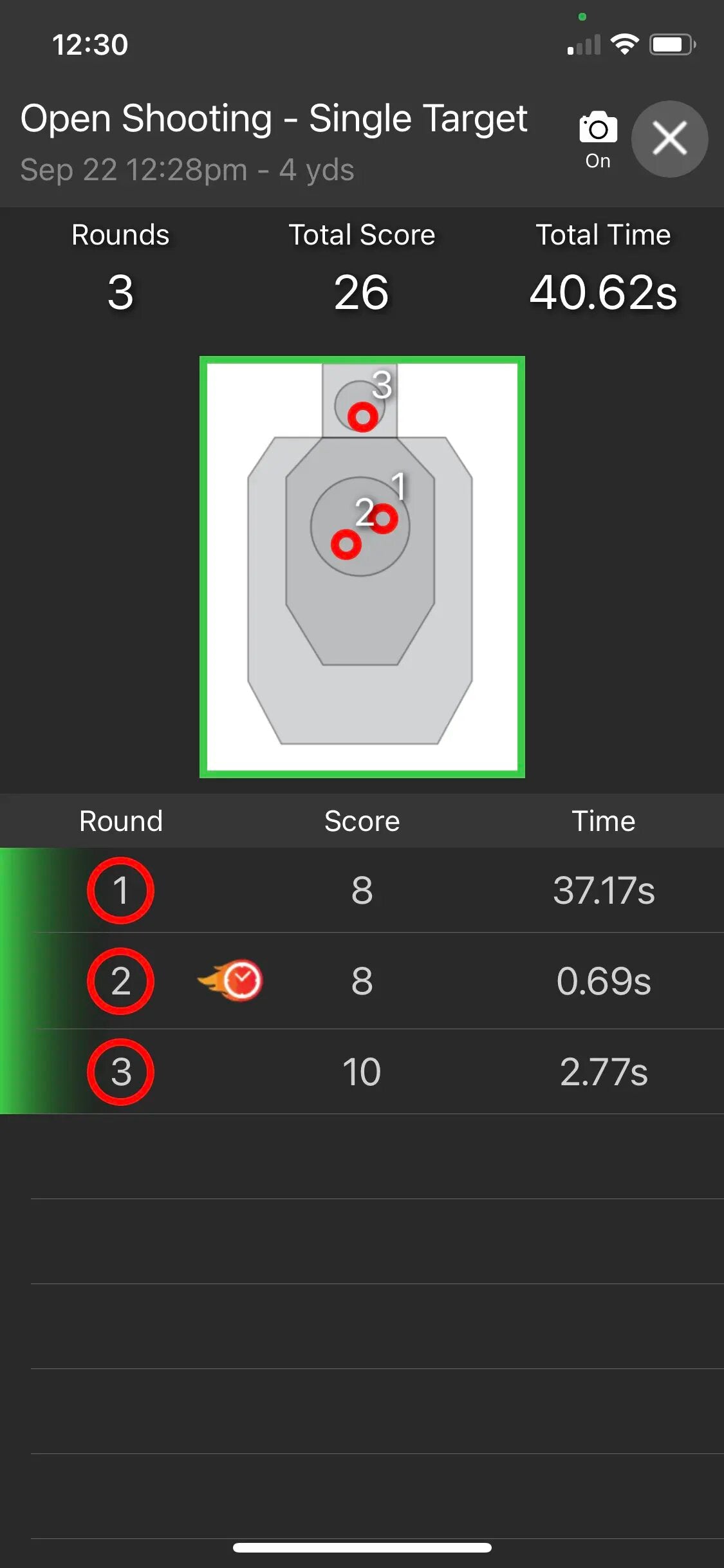 The shot with the fastest split time is identified by the flaming stopwatch.